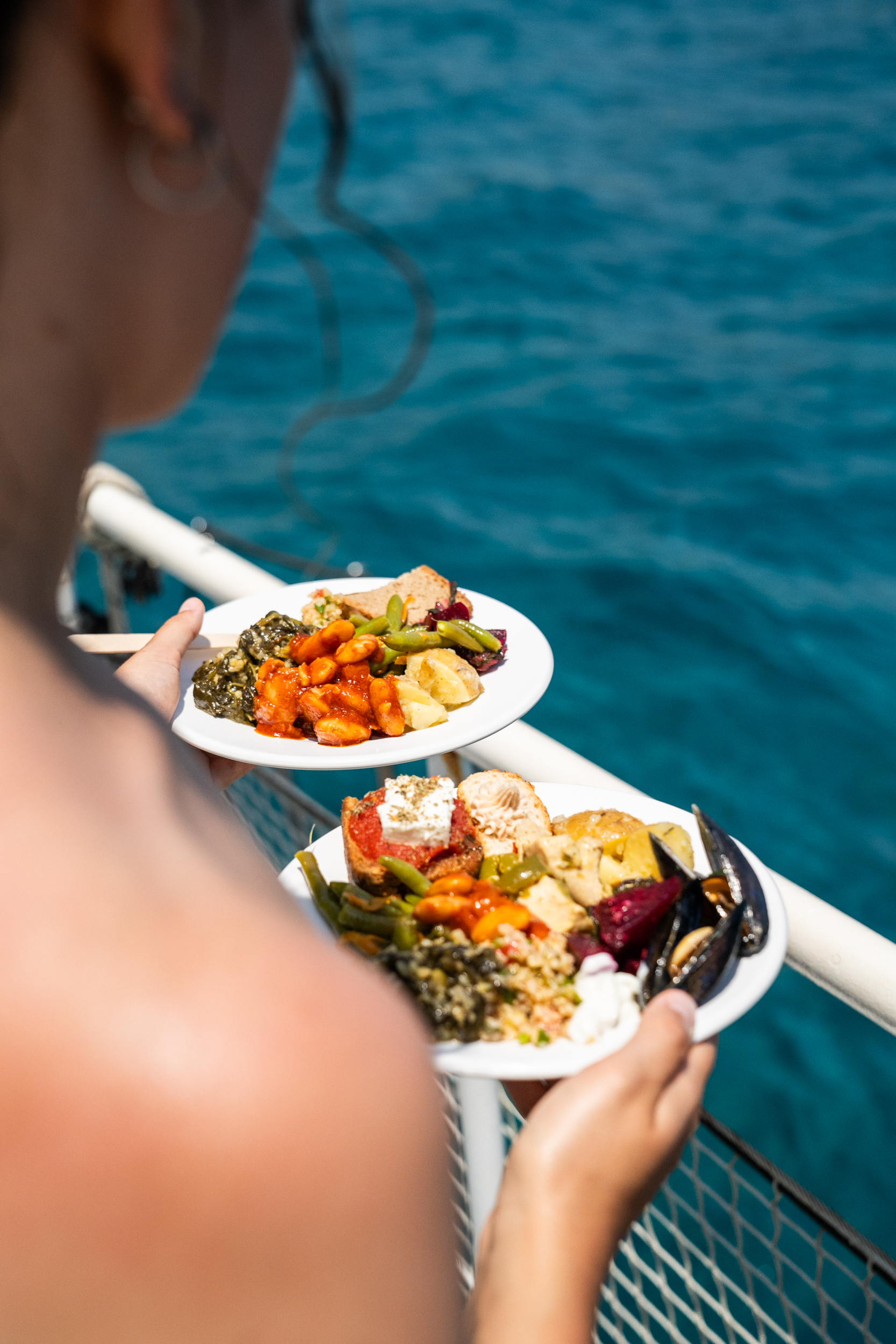 You’ll have plenty of time to swim to the beach, explore the area, or relax in the water while our crew prepares a freshly made lunch buffet onboard. The menu includes traditional Greek recipes as well as vegetarian options.