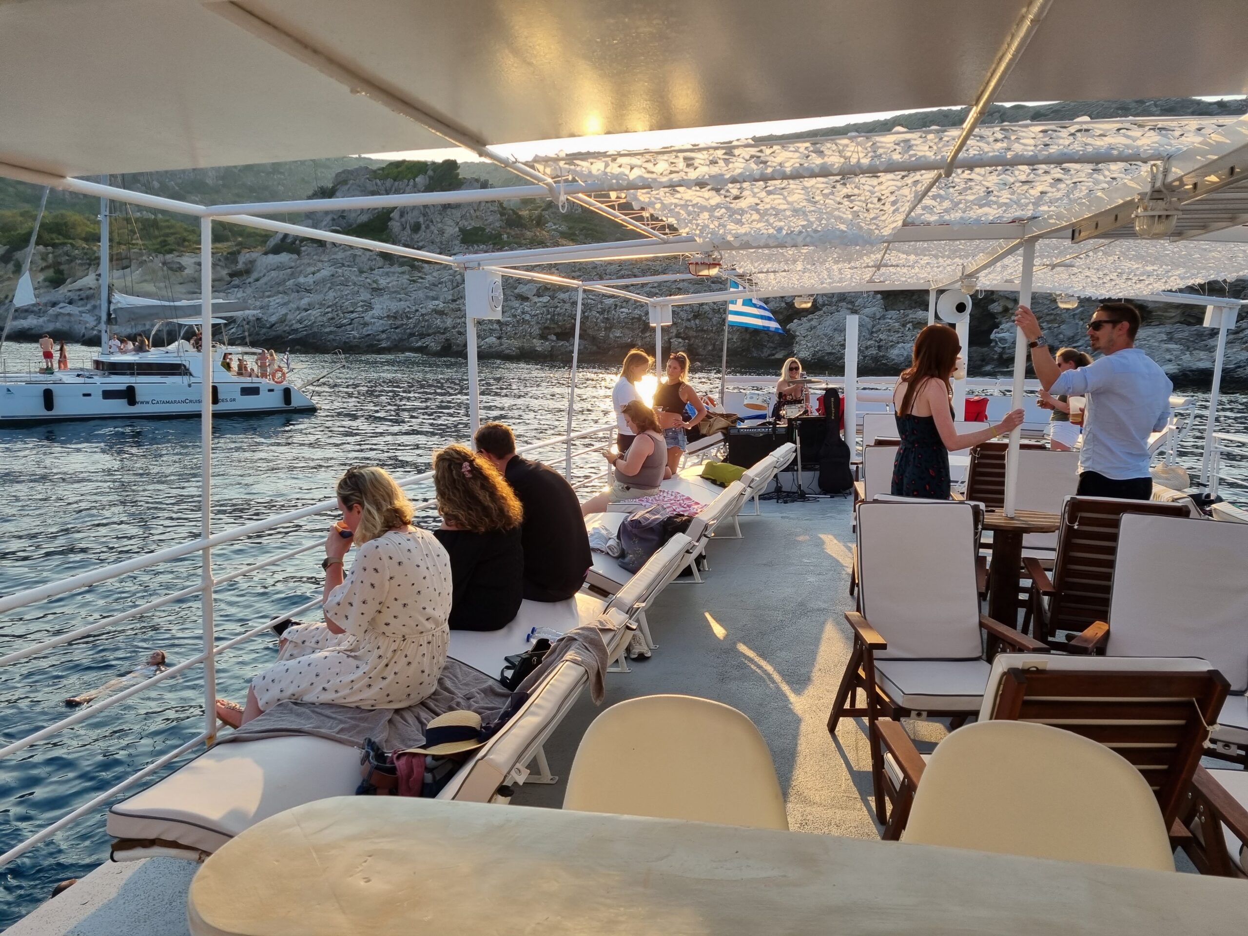 Join the DREAM All-Inclusive Sunset Cruise and enjoy a relaxed evening at sea, combining swimming at Kalithea, a freshly prepared Greek dinner, and live music as the sun slowly sets over the Aegean.